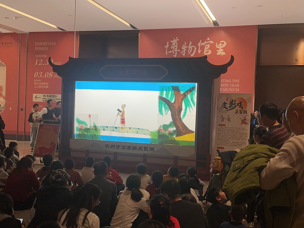 这是浙江省博物馆联合中国皮影博物馆推出的“皮影里的中国故事”大型特展系列活动,春节期间,浙江和山东皮影剧的团经典剧目轮番上演。展览首次全景式呈现中国各地皮影艺术,汇集全国20个省市区近700件皮影珍品,系统梳理了中国皮影的千年发展脉络,重现皮影艺术在南宋临安的繁荣景象。塘栖皮影戏,正是其中的重要组成部分。