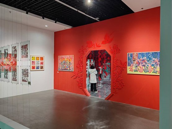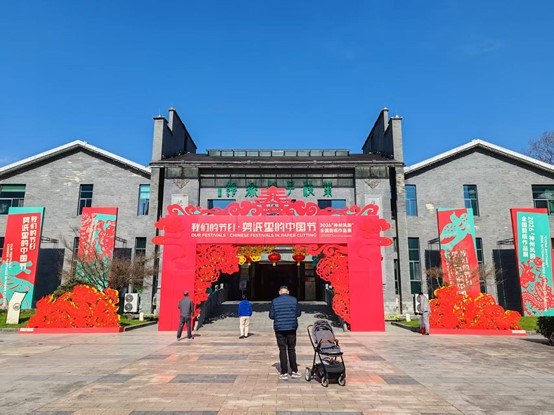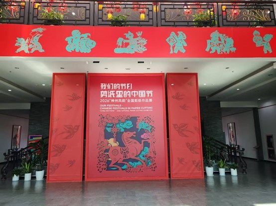 2026年“神州风韵”全国剪纸作品展在桐庐叶浅予艺术中心拉开序幕。图为场馆门口主题视觉。陈白云摄。