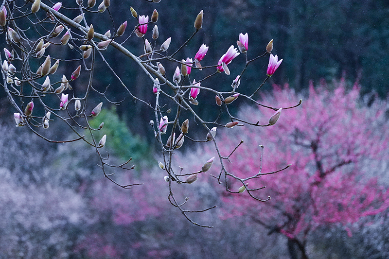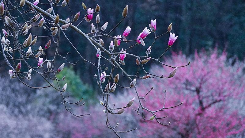 浙江在线2月24日讯(记者 陈天怀)2月24日,马年开工首日,杭州迎来小雨天气。杭州植物园内,天目玉兰已悄然绽放,粉紫花朵在雨雾中更显清雅,为市民送上别样春日惊喜。