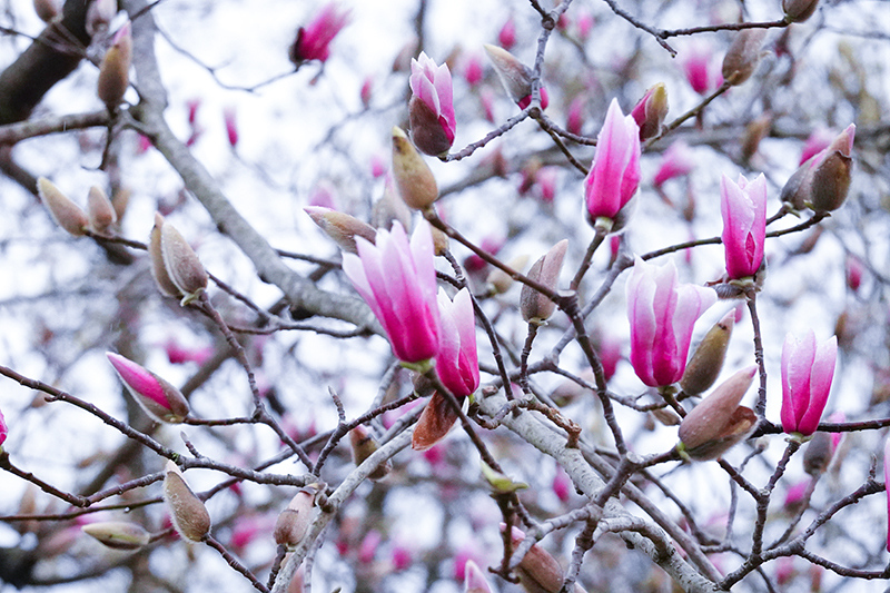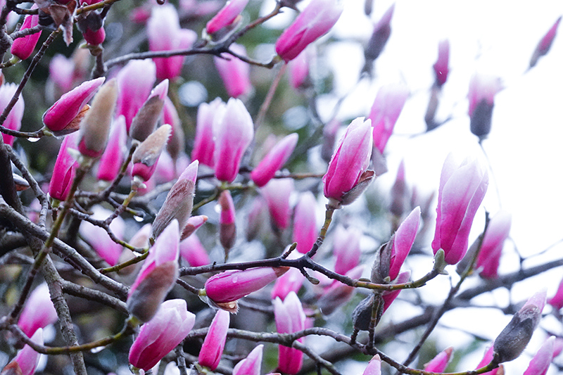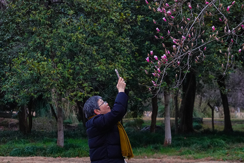作为杭城早春“报春花”,园内20余株天目玉兰中,位于蔷薇园、水生植物区的4株高约12米的大树率先开花。细雨浸润下,花瓣更显娇嫩,灰调背景衬得花色愈发动人,勾勒出烟雨江南的诗意画面。