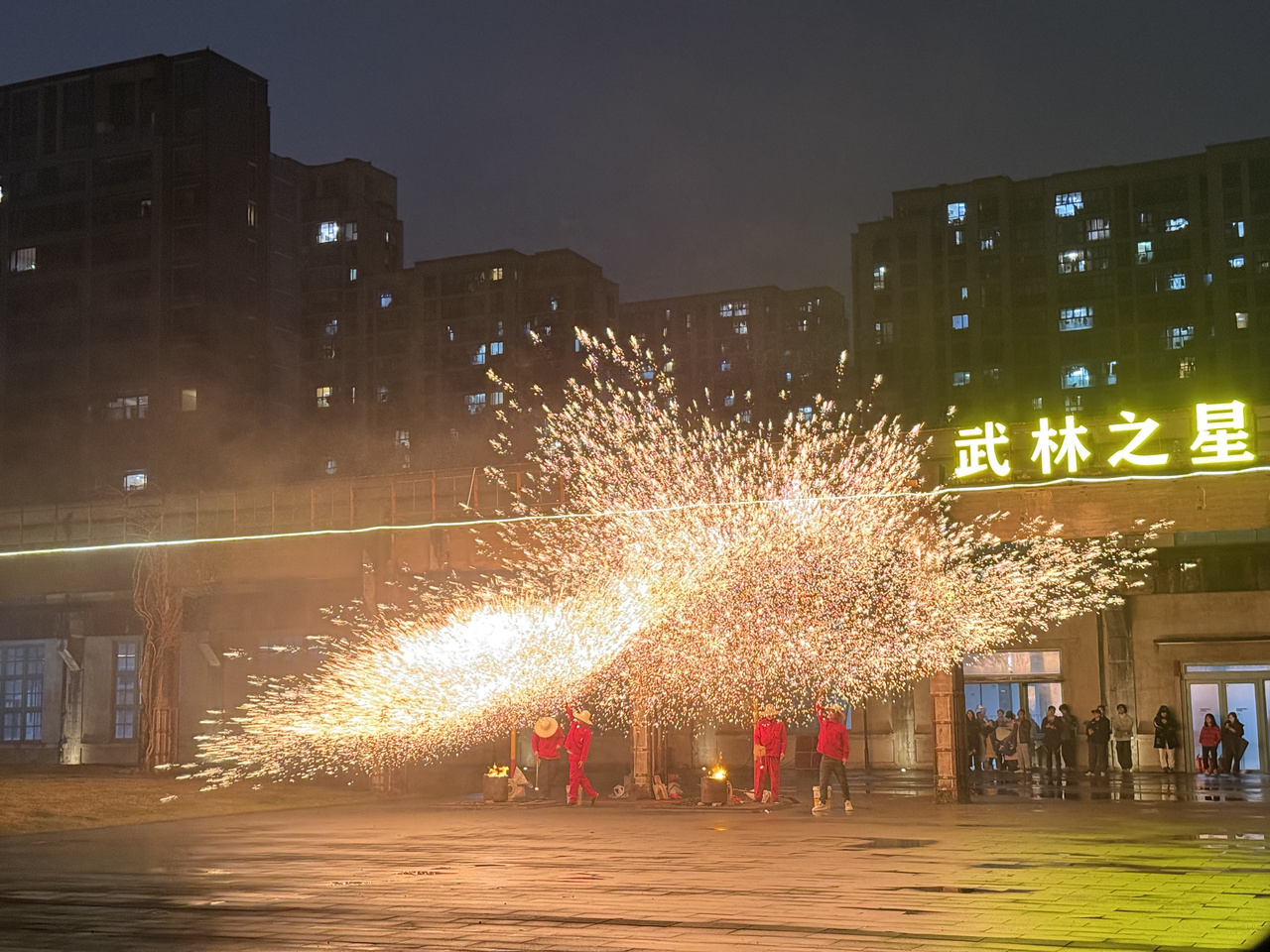 “砰——”滚烫的铁水被击向高空,瞬间炸裂成万点星辰,如流星雨倾泻而下,人群爆发出惊呼……看过花灯,当晚19点30分,非遗表演“打铁花”准时开始,尽管细雨霏霏,中心广场外围依然围满了一圈又一圈观众,大家纷纷踮起脚尖,举高手机,只为记录这璀璨一幕。“太美了,我第一次在家门口看到打铁花。”市民肖女士举着手机,语气里满是惊喜。