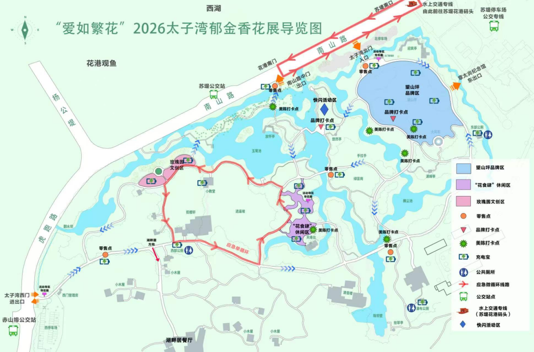 出行方面,花展期间景区实施交通管控,停车场限流限行,倡导绿色出行。景区开通水陆双专线,2条水上公交往返钱王祠、杭饭码头与花港码头,杭州居民享优惠票价;同步开通郁金香、樱花两条地铁接驳专线,搭配常规公交、共享单车,构建便捷交通网络。