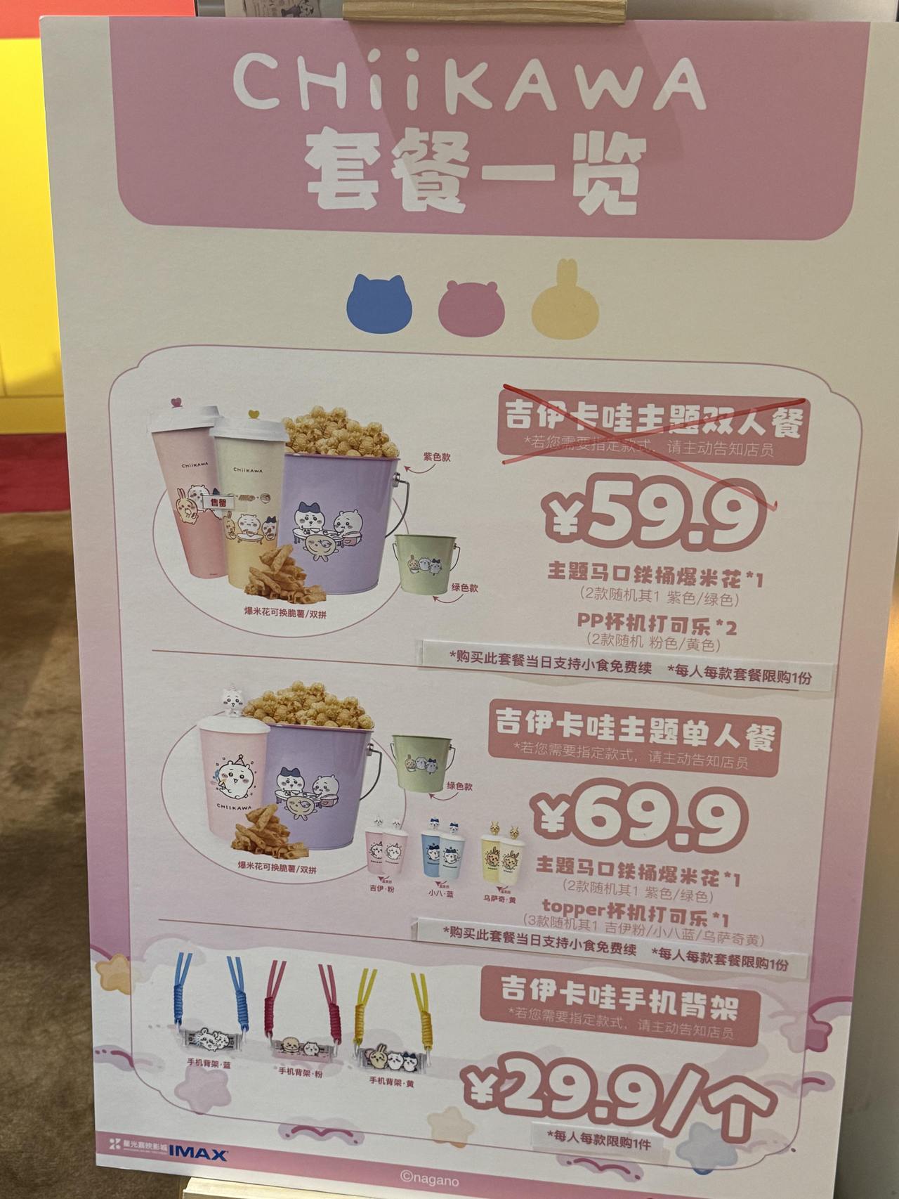 00后观众金女士是该IP的忠实粉丝,她特意在现场买下了一份69.9元的单人套餐。她算了一笔账:“如果在二手平台上单独收吉伊卡哇的桶和杯子,算上运费也要50元上下,真不如在影院既享受电影又享受周边的快乐。”