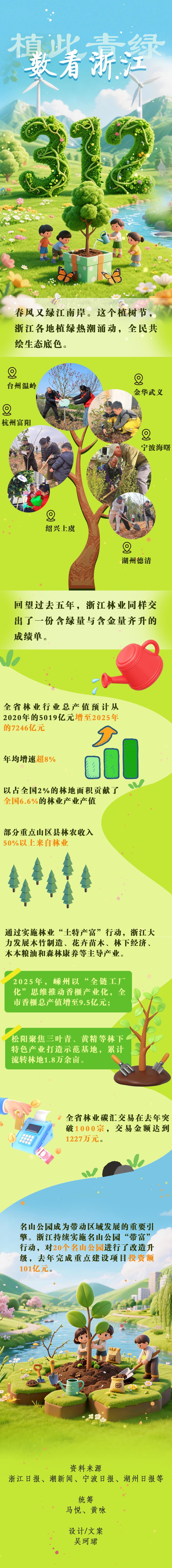 春风又绿江南岸。这个植树节,浙江各地植绿热潮涌动,全民共绘生态底色。回望过去五年,浙江林业同样交出了一份含绿量与含金量齐升的成绩单。
