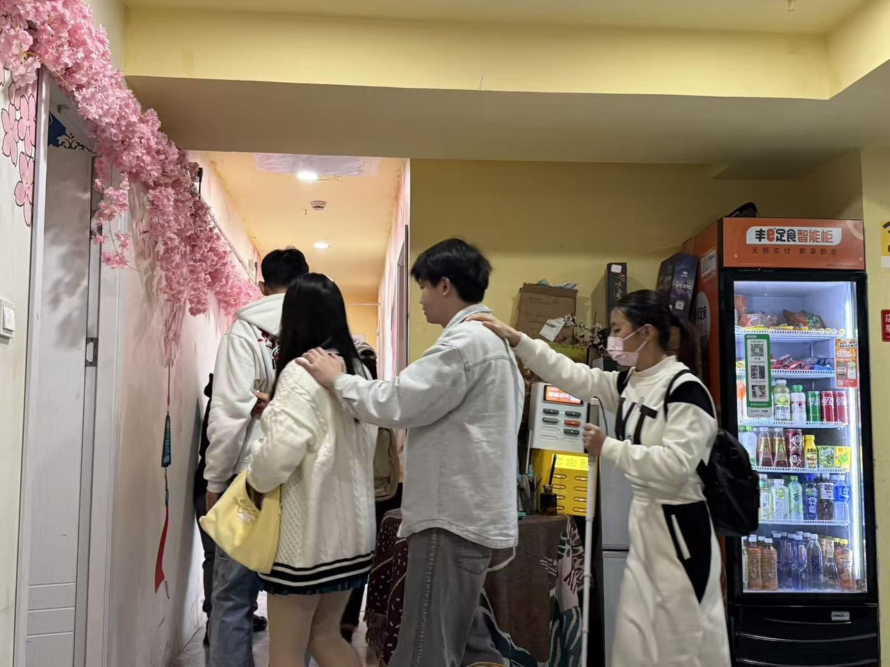 上午10点,27位视障伙伴相互搭着前面人的肩膀,慢慢走进门店,小小的空间渐渐被填满,两只导盲犬安静地伴在主人身旁。而这,已是邓文兰的门店接待的第20多场视障群体剧本杀活动。据悉,本次27位视障朋友参与剧本杀的相关费用均由店家全额承担。