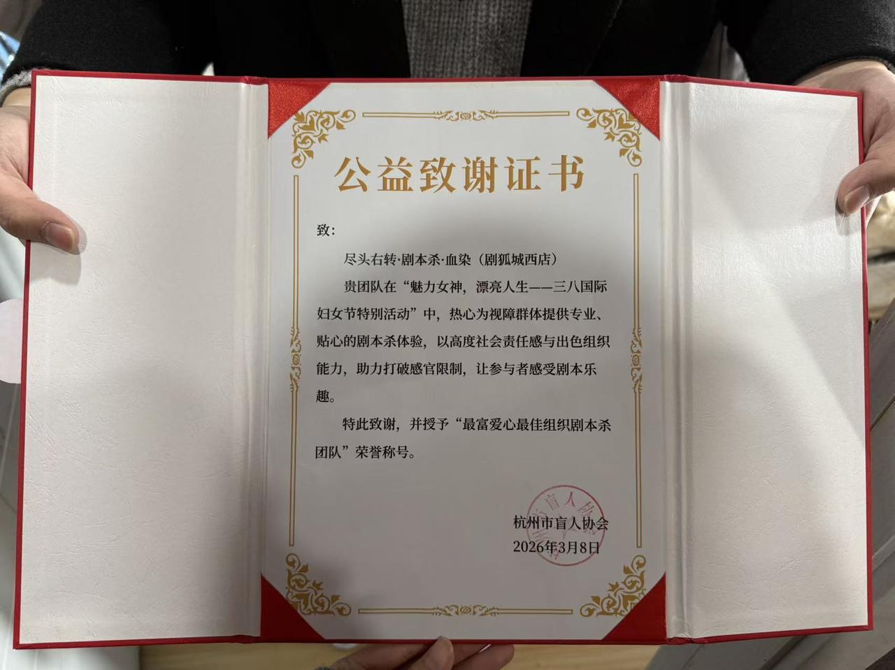 杭州市盲人协会向尽头右转剧本杀・剧狐城西店授予公益致谢证书 记者 陈卓妤 摄