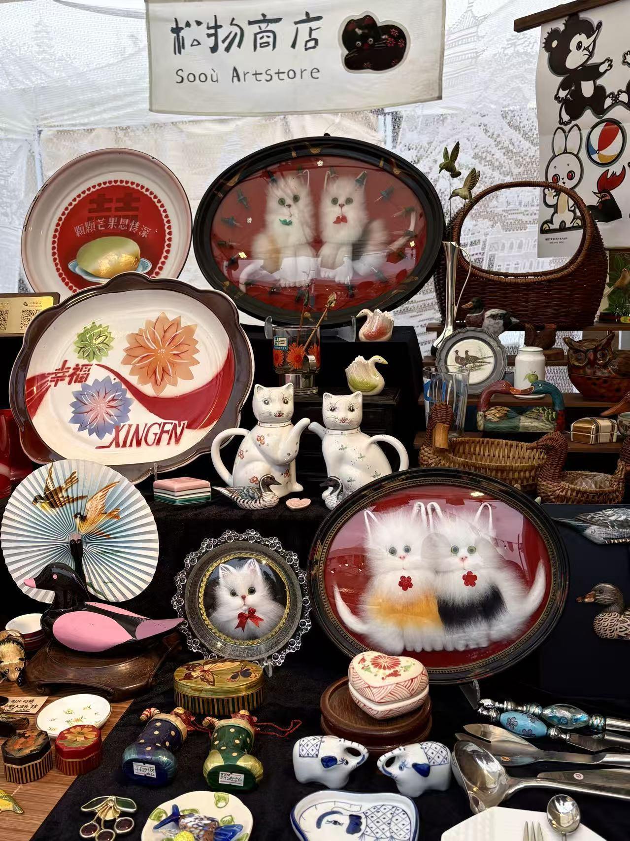 走近“大娃怪市”的“松物商店”小摊,浓厚的年代感扑面而来,有六十年代创汇时期古董木胎漆鸭子造型木夹、1968年芒果搪瓷盘、八十年代圣诞老人手工麦秆盒等老物件,保留岁月痕迹的同时,也兼具艺术美感。