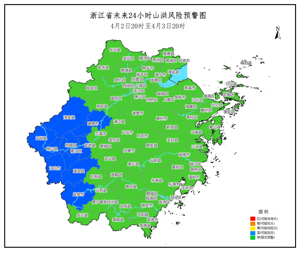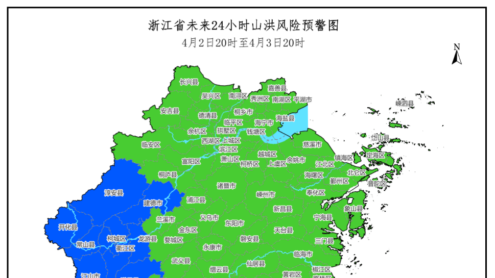 浙江在线4月2日讯(通讯员 鲁筱妍 记者 汪雨晨)4月2日16时47分,浙江省水利厅、省气象局联合发布山洪灾害预警,这也是浙江今年发布的首个山洪预警:根据省气象台未来降雨预报,预计4月2日20时至4月3日20时,淳安县、建德市、柯城区、衢江区、常山县、开化县、龙游县、江山市、遂昌县、龙泉市可能发生山洪灾害(蓝色预警)。