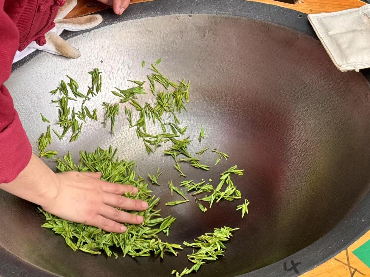 不同的人炒制的茶具有不同的风格味道,有人喜高温炒制,有人力道大,有人力气轻柔。200多摄氏度的铁锅前,几十双手同时在翻炒青叶。这是一场技能的比拼,更是一幅浙江茶产业传承与发展的缩影。