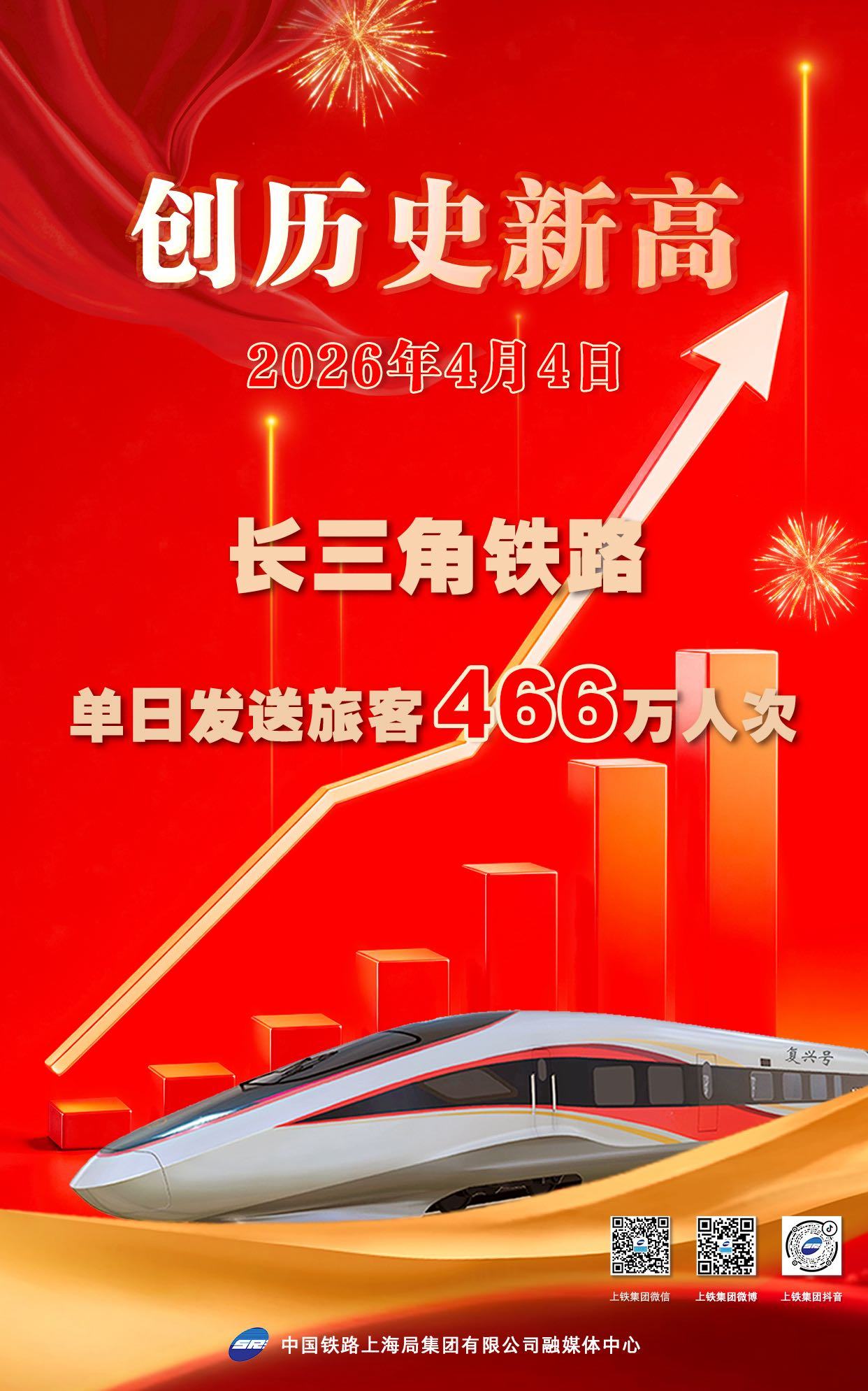 4月4日,记者从中国铁路上海局集团有限公司获悉,长三角铁路当日发送旅客466万人次,超过2025年5月1日单日发送旅客426.8万人次的最高纪录,创单日客发量历史新高。