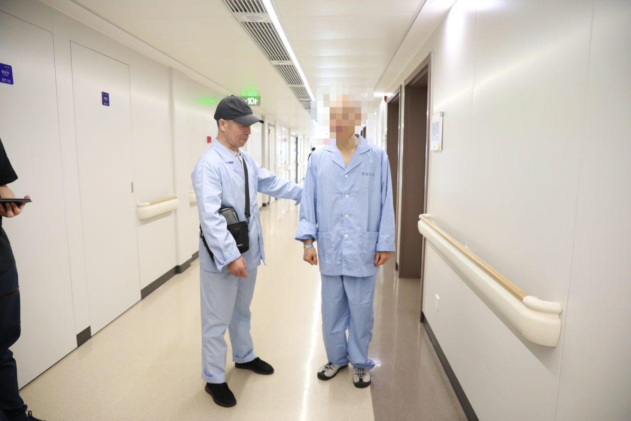 见到李老师时,他正绕着走廊缓步转圈,步伐稳健而从容。“现在走得挺好了,不拄拐的话五分钟能围着走廊转一圈。”此前,李老师因健身时哑铃意外脱落砸中背部,造成脊髓损伤,只能拄拐蹒跚,生活离不开家人照顾。接受闭环脊髓神经接口手术与系统康复后,下肢功能显著恢复,目前已能独立平稳行走。