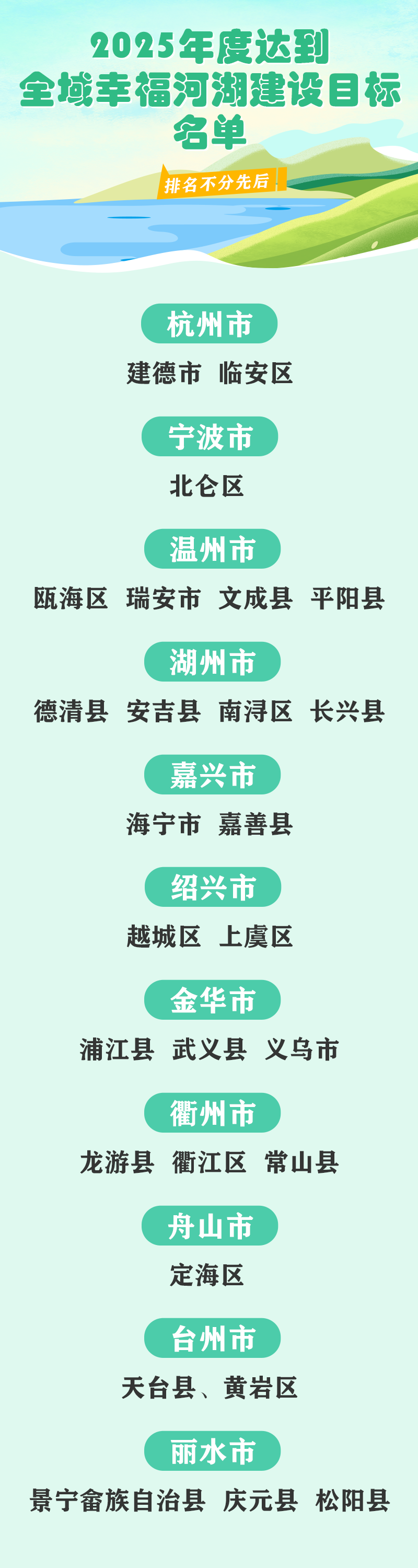 近日,浙江省河长办、省水利厅、省财政厅联合公布2025年度全域建设幸福河湖成效复核结果。经过安全、生态、宜居、文化、富民、智慧、群众满意等7大方面17项指标的全面评估,并对照“建成幸福母亲河(湖)、高品质水美乡村10个以上、滨水绿道100公里以上”等关键要求,建德市等27个县(市、区)通过省级复核。这标志着这27地率先建成全域幸福河湖基本格局,浙江全域幸福河湖建设取得阶段性成果!