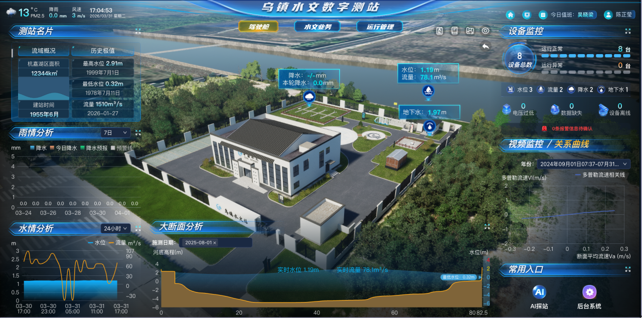 如果说硬件提升是“强筋健骨”,那么数字化建设则为现代化水文站装上了“智慧大脑”。今年,乌镇水文站正式上线“3+N”数字测站应用系统。其中,“3”指省级统一建设管理的驾驶舱(水情信息)、水文业务、运行管理三大核心功能,“N”是各站定制的N项特色亮点应用。