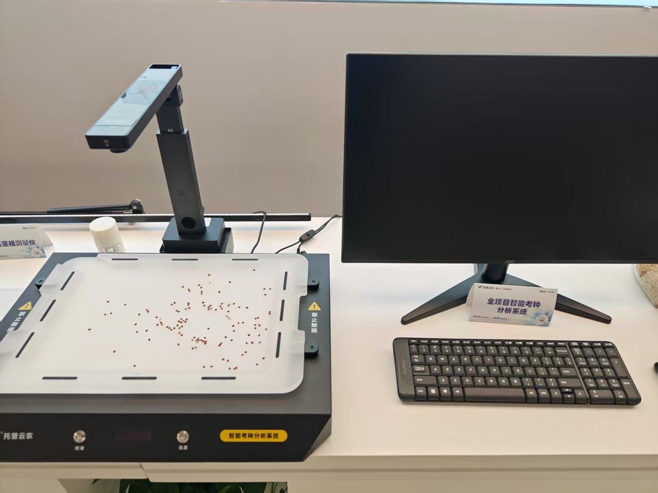 在农机展示区,有一台名为“智慧考种机”的设备,它来自浙江托普云农科技股份有限公司。