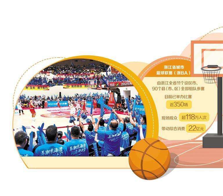 全省11个设区市、90个县(市、区)全部组队参赛,已举办近350场比赛,现场观众超118万人次,带动综合消费22亿元……作为浙江省规模最大、档次最高的群众篮球赛事,从今年盛夏延续到明年开春的浙江省城市篮球联赛(简称“浙BA”)成为当下浙江最火爆的“草根盛宴”。围绕“赛事搭台消费唱戏”的体育经济热潮也是一浪高过一浪。如今,赛程过半的“浙BA”已经在篮球赛事与城市消费场景之间架起桥梁,释放体育促消费的强大动能。