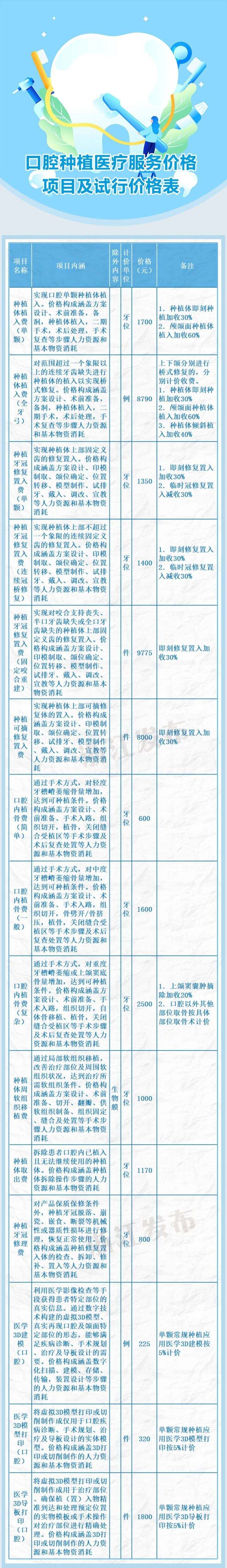 《通知》自4月1日起执行,明确设立种植体植入费(单颗)等15项口腔种植医疗服务价格项目,公立医疗机构实行政府指导价管理。原口腔种植项目按市场调节价管理,价格由医疗机构自主确定。具体内容,一起了解~
