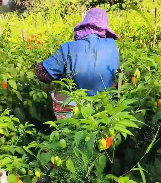 “千万要小心,手不要直接碰到辣椒!碰过辣椒的手,不能碰皮肤和眼睛,不然就非常难受啦!”沈必环说,有经验的工人,采摘时都会“全副武装”,穿上长衣,再戴上手套和口罩等。