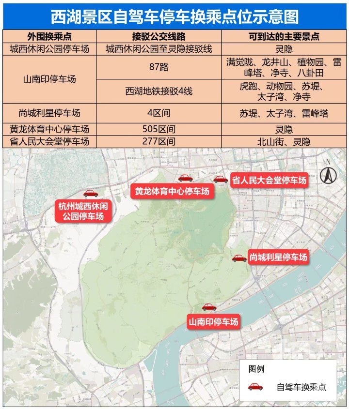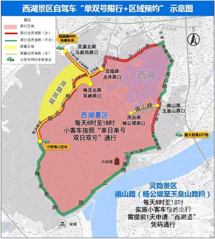 ①每天08:00-18:00,西湖景区实施小客车尾号单双号通行。灵隐景区、南山路(杨公堤至玉皇山路段)实施小客车预约出行,需提前一天通过“警察叔叔、浙里办、支付宝”等APP申请“西湖通”,凭码通行;同时,这两个区域禁止网约车、出租车驶入,乘客可在西溪路608号、小牙坞、里太祖湾157号换乘公交接驳线进入。