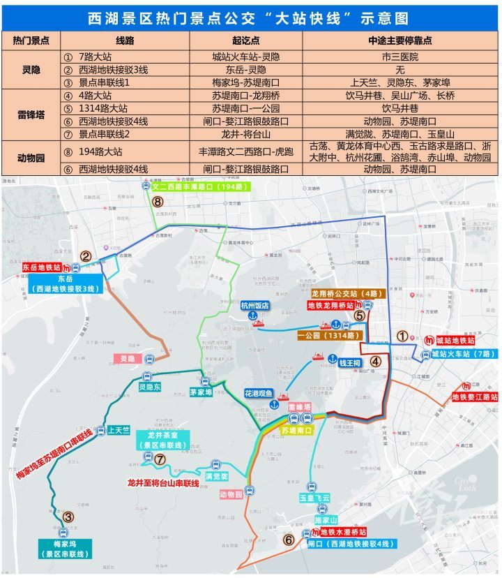 ②推荐前往热门景点灵隐、雷峰塔、动物园的游客搭乘公交“大站快线”。