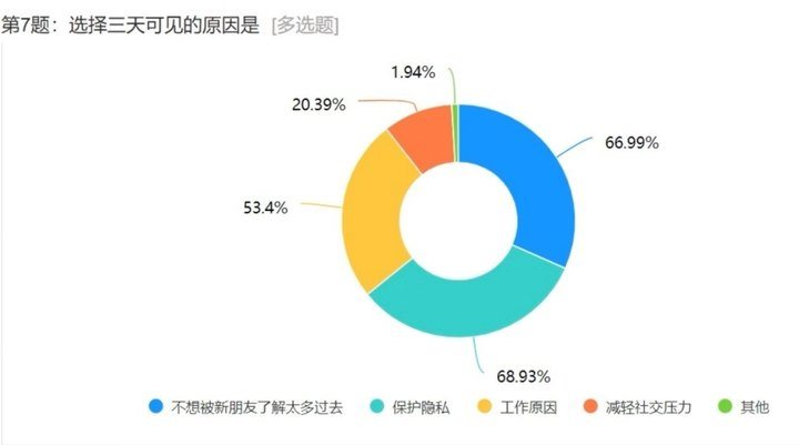 在记者的问卷调查中,有25%的人设置了朋友圈仅三天可见,27%的人设置仅一个月可见,更有90%的人设置了朋友圈分组。至于三天可见的原因,被调查者选择最多的依旧是“保护隐私”选项。