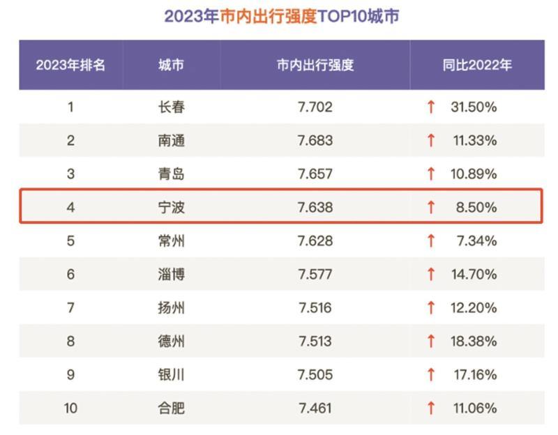 此外,2023年,宁波的市内出行强度(即有市内出行行为的人数,占该城市居住人口比值的指数化结果)居全国百城第4位。良好的交通情况进一步增强市民的出行意愿,进而推动人流、物流、资金流、信息流的畅通,让宁波的城市活力更上一层楼。