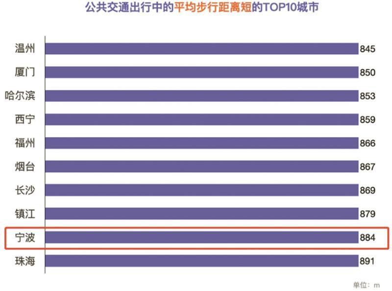 《报告》显示,2023年,宁波公共交通出行的平均距离达884米,是全国这一距离最短的10座城市之一。这意味着,在宁波搭乘公交车后,平均只需步行884米就能抵达目的地。可见,宁波公交站点设置和市民出行需求的契合度高,公共交通便利度在全国较为领先。