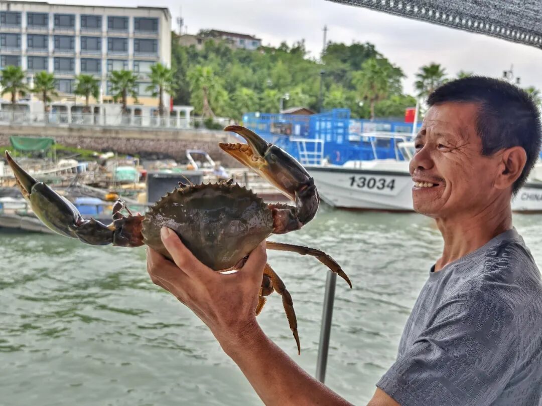 当时,浙江宁海渔民尤才兵和妻子在海上拉起渔网,只见上面密密麻麻缠着30多只青蟹,其中有一只特大号的,夫妻俩兴奋地跳了起来。