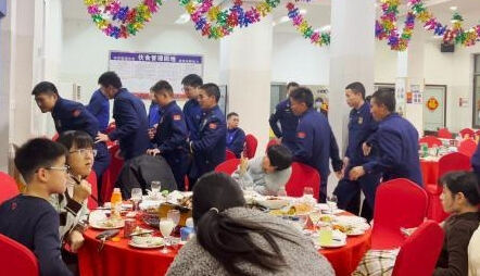 1月26日,慈溪消防救援大队浒山站的消防员们和家属一起提前过年吃年夜饭。