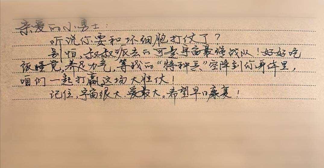 捐献当天,一份特殊的信笺经红十字会郑重转交至蔡承智手中。信来自等待“生命馈赠”的患病孩子及家属,字里行间满是对新生的期盼与感激。蔡承智拿起笔,在信纸背面郑重回复:“亲爱的小勇士:听说你要和坏细胞打仗了?别怕,叔叔派去的可是宇宙最强战队!好好吃饭睡觉,养足力气,等我的‘特种兵’空降到你身体里,咱们一起打赢这场大胜仗!祝你早日康复!记住,宇宙很大,爱最大。”