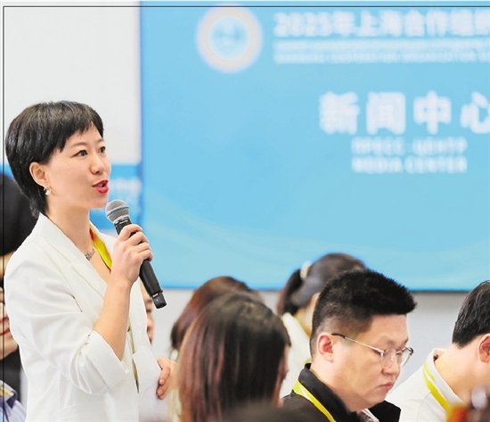 浙江日报·潮新闻记者姜倩现场提问。2025年上合峰会新闻中心供图