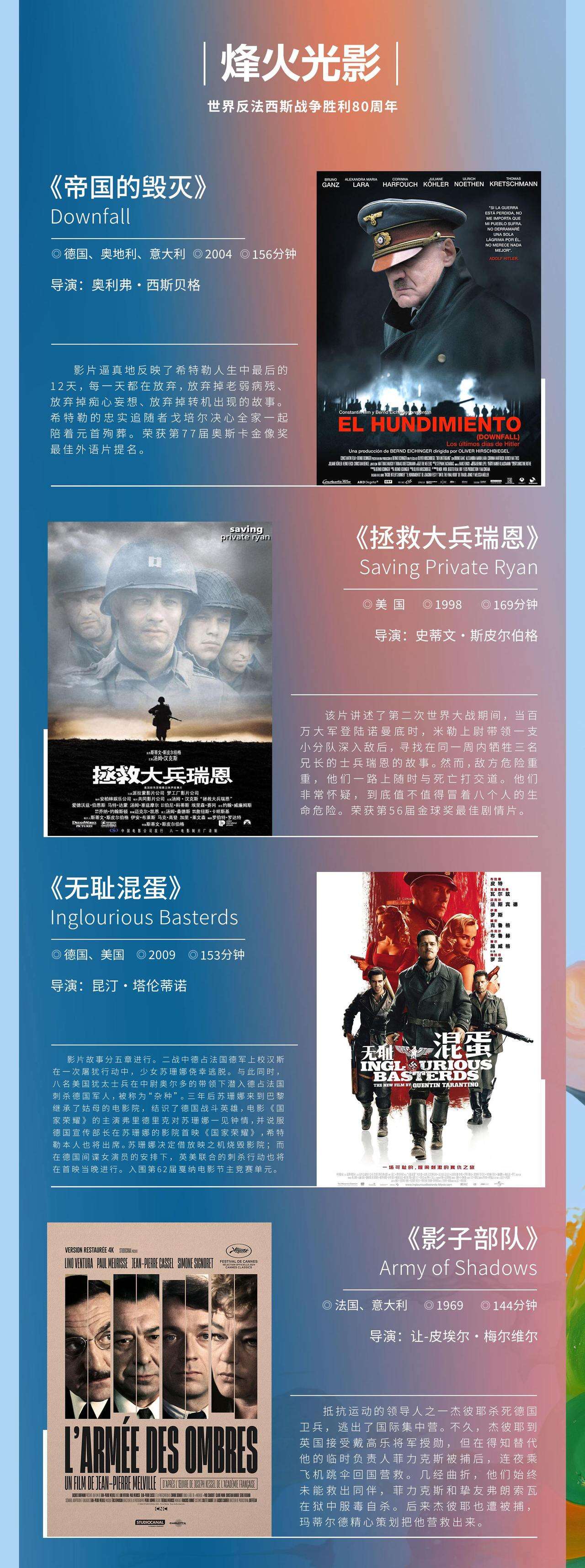 烽火光影——世界反法西斯战争胜利80周年单元纪念世界反法西斯战争胜利80周年,汇聚四部战争反思佳作《帝国的毁灭》《拯救大兵瑞恩》《无耻混蛋》《影子部队》,以多国镜像共筑战争记忆,透过银幕上的烽火与硝烟,铭记人类为自由付出的永恒代价。