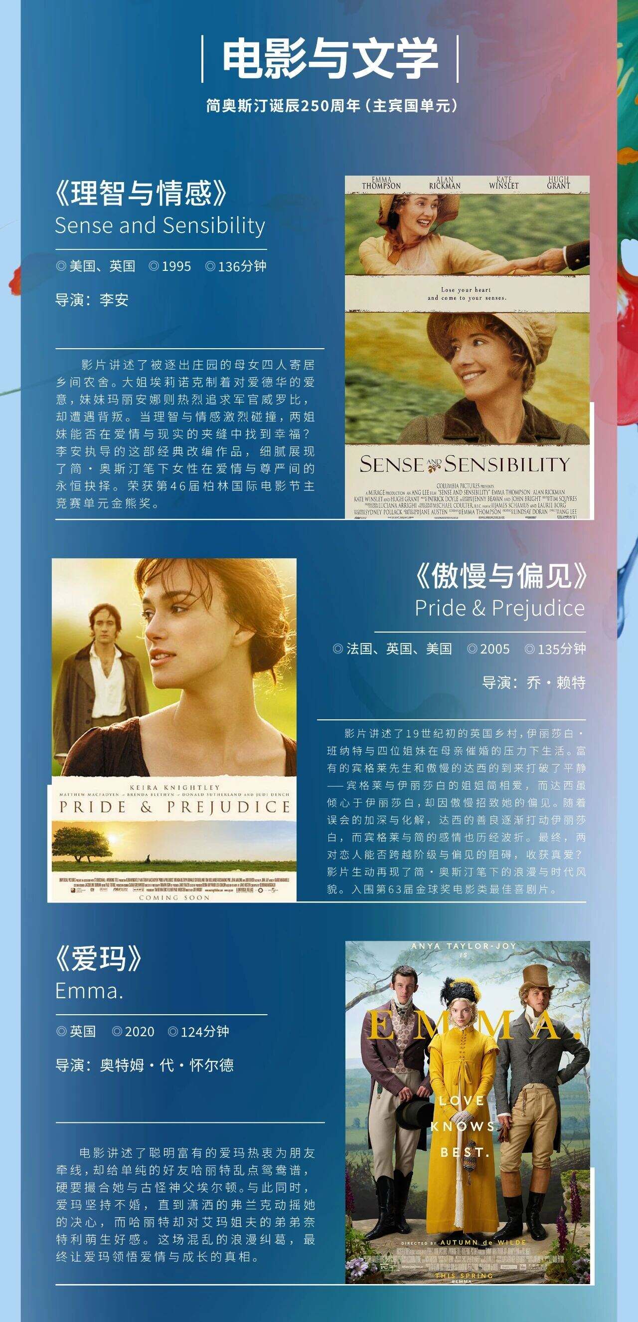 电影与文学——简·奥斯汀诞辰250周年单元将带来三部改编自英国文学史上最具影响力和最受喜爱的作家之一简·奥斯汀的经典作品:李安执导的《理智与情感》、乔·赖特执导的《傲慢与偏见》以及奥特姆·代·怀尔德执导的《爱玛》。