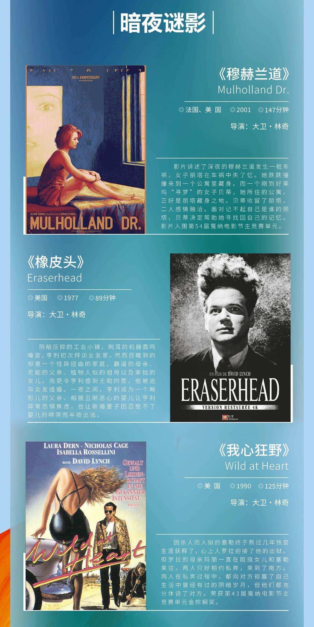 带领观众穿越两百余年时光,领略简·奥斯汀永不过时的情感洞察力,感受其作品在21世纪的持续共鸣。暗夜谜影单元精选电影大师大卫·林奇的三部标志性作品,从其荒诞骇人的首部长片《橡皮头》,到离经叛道的公路狂想曲《我心狂野》,再到悬疑复杂的经典作品《穆赫兰道》,共同构筑了一个光怪陆离的“林奇宇宙”,邀请观众潜入其中探索潜意识深处的恐惧与狂想。