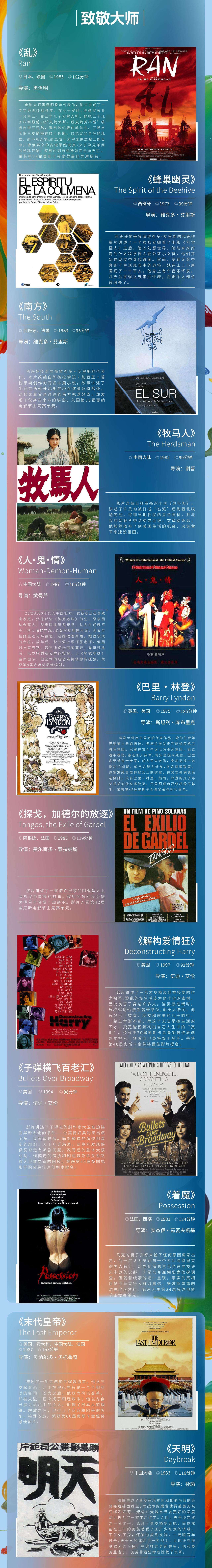 致敬大师单元精选13部颠覆影像边界的电影杰作,聚焦谢晋、黄蜀芹、孙瑜、黑泽明、斯坦利·库布里克、维克多·艾里斯、费尔南多·索拉纳斯、伍迪·艾伦等中外电影大师,展映《乱》《蜂巢幽灵》《人·鬼·情》《天明》(现场钢琴伴奏)《巴里·林登》《解构爱情狂》等跨越时代与地域的经典作品,引领观众沉浸于大师所构筑的光影世界之中,深切感受电影艺术跨越时空的震撼与魅力。