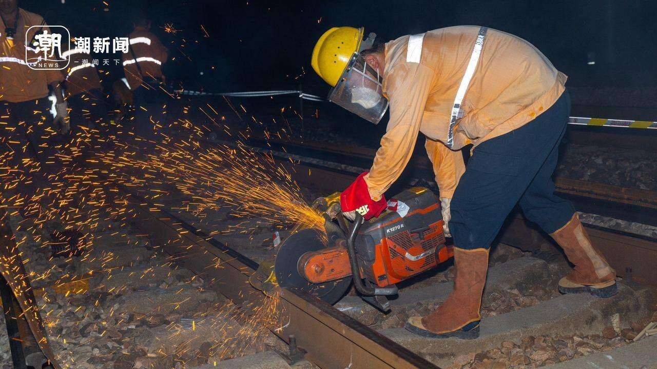 另一边的“小黄人”操作锯轨机在待换钢轨两端切割钢轨,锯轨机高速旋转的锯片与钢轨激烈摩擦,轰鸣声不绝于耳,钢轨表面白烟升腾,锯切处迸射出耀眼的火花……