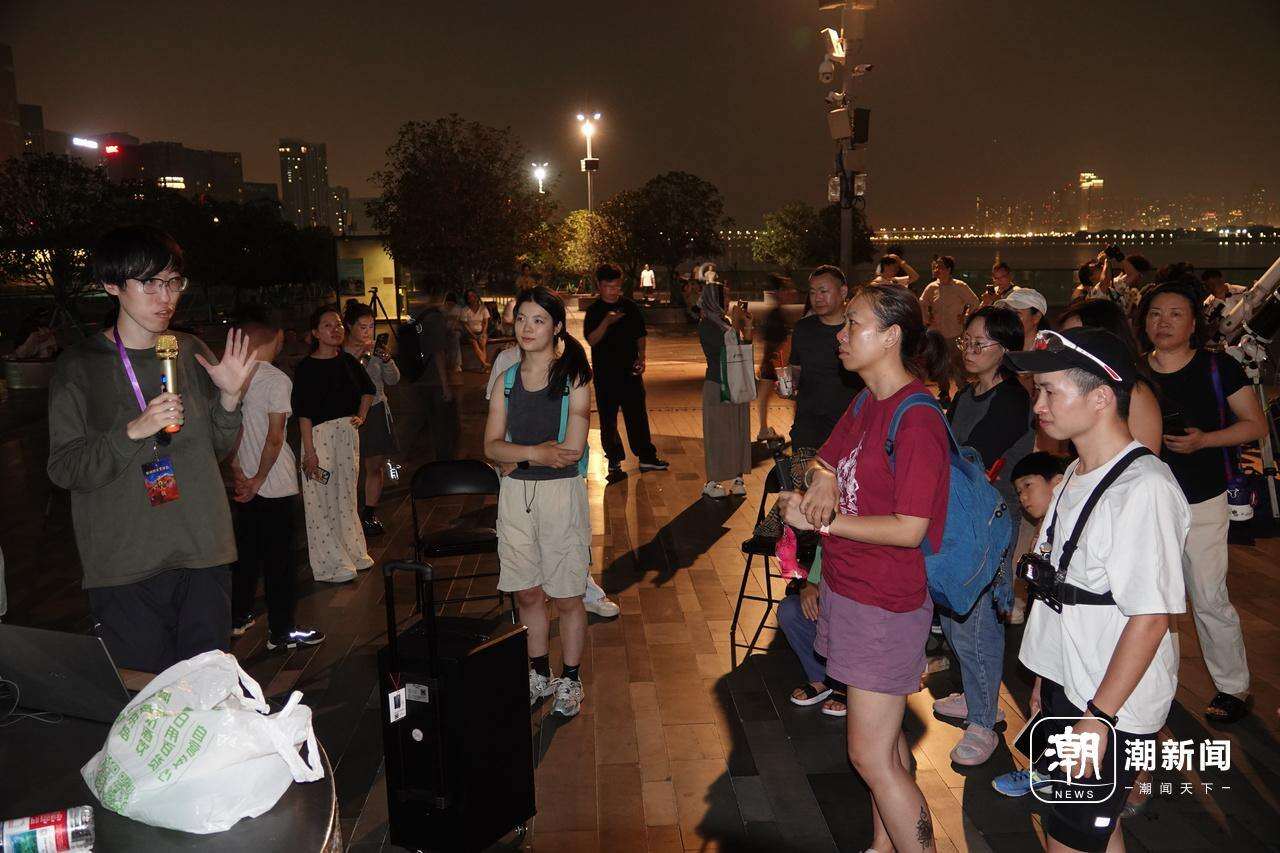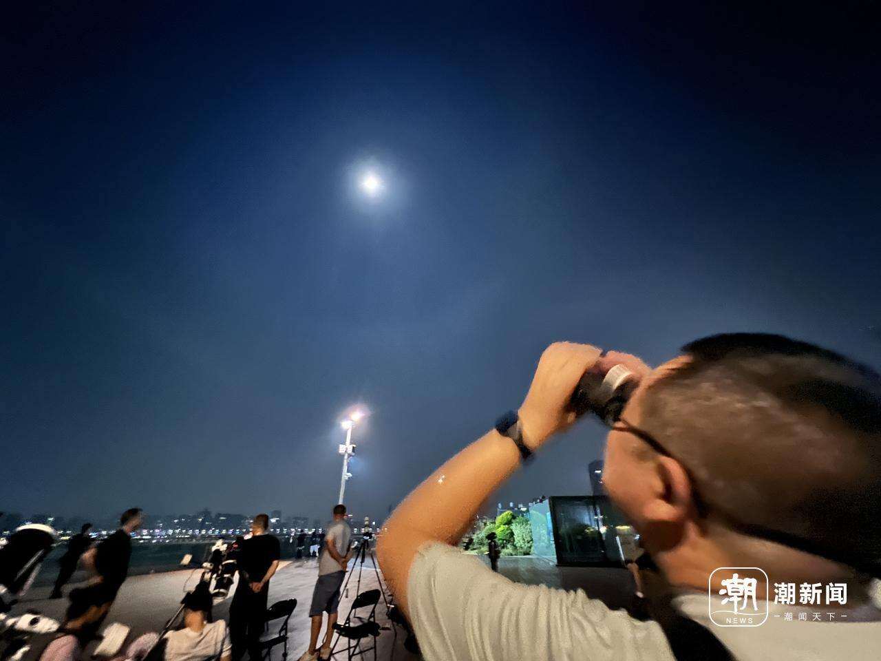 观赏月全食的人们,有人拿来了露营垫,直接躺在地上仰头观赏。也有人带来了冰镇饮料和零食,“吹着钱塘江的晚风,赏着月,多松弛。”一位年轻人说,观看月全食,成了几个好朋友出来相聚的理由。