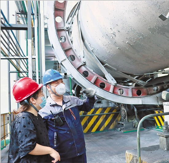 在窑体下方坚实的基座上,两台一人多高的电机一左一右,伴随着均匀的嗡鸣声持续输出动力。“这个是回转窑的电动机,是这个车间‘心脏’中的‘心脏’。”韩利鹏介绍。他拿起扳手,仔细检查电机上螺丝的紧固情况,一切正常。