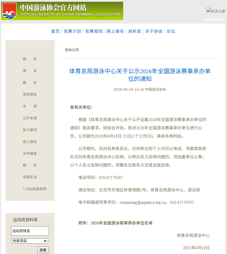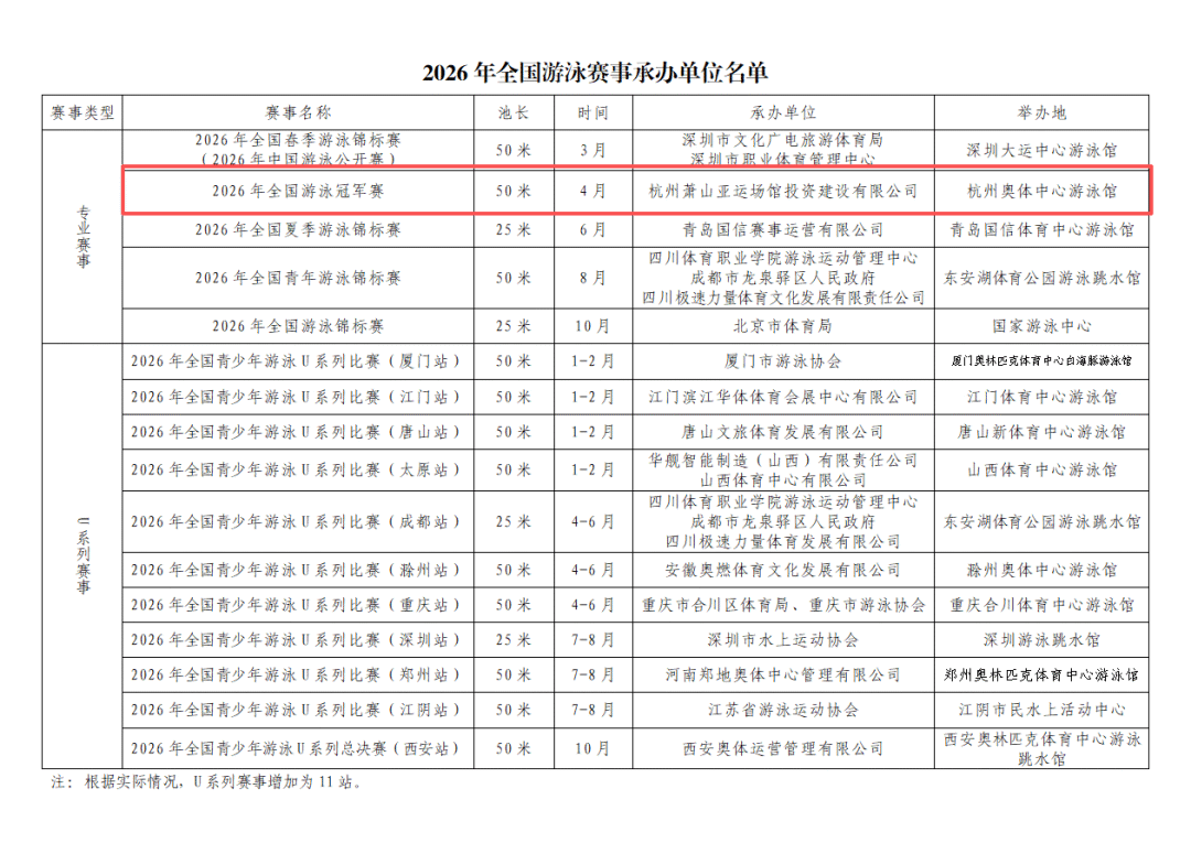 中国游泳协会公示!2026年全国游泳冠军赛落地杭州
