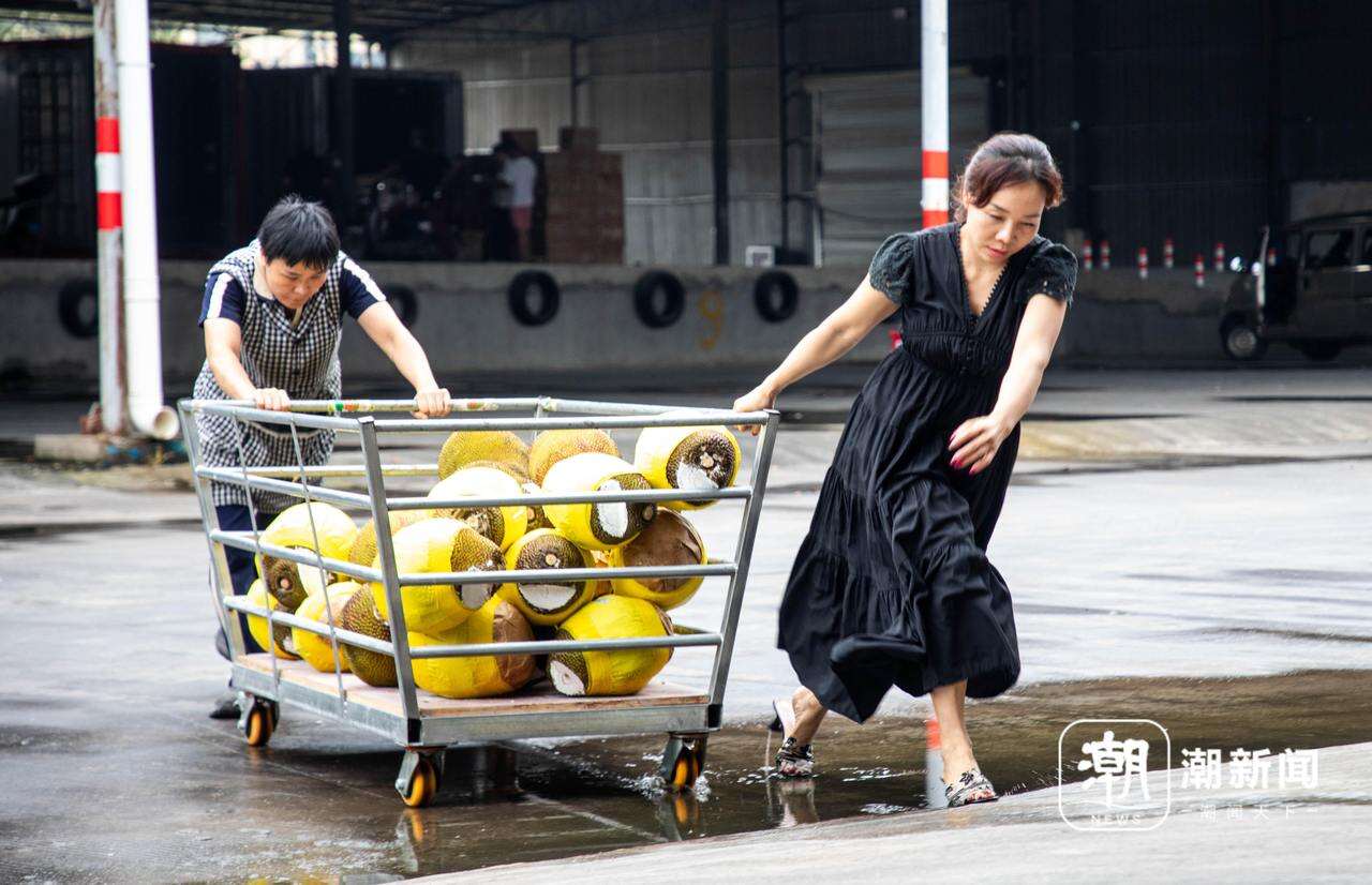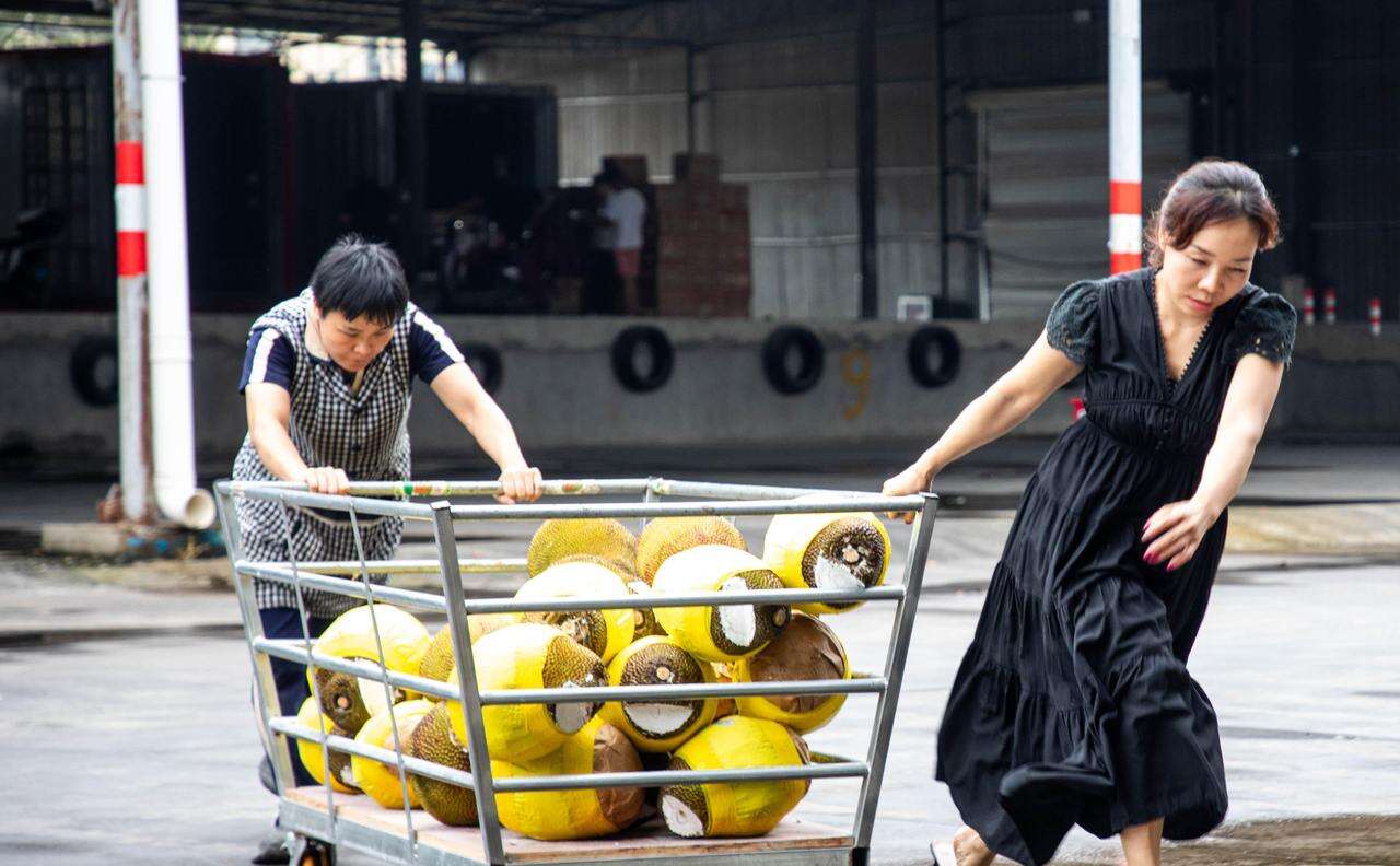 越南太原省人阮氏合(图右)自食其力,白手起家在万通物流园销售菠萝蜜。潮新闻 记者 汪驰超 摄