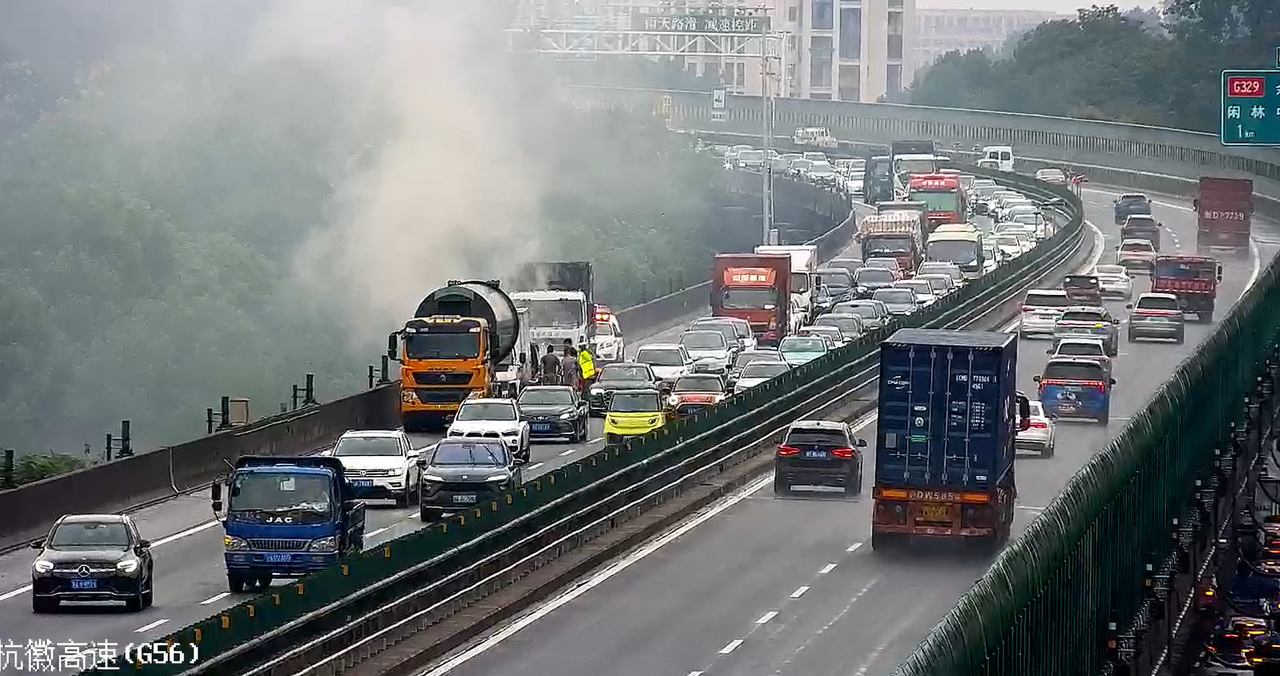 杭州市公安局高速交警支队一大队综合勤务室通过公共视频巡查发现警情后,立即启动应急机制:一方面通知消防和施救单位,调度附近警力(含辅警陈海鹏)赶赴现场;另一方面利用情报板发布提示信息,并在后方收费站采取限流与临时管控措施,防止次生事故发生。