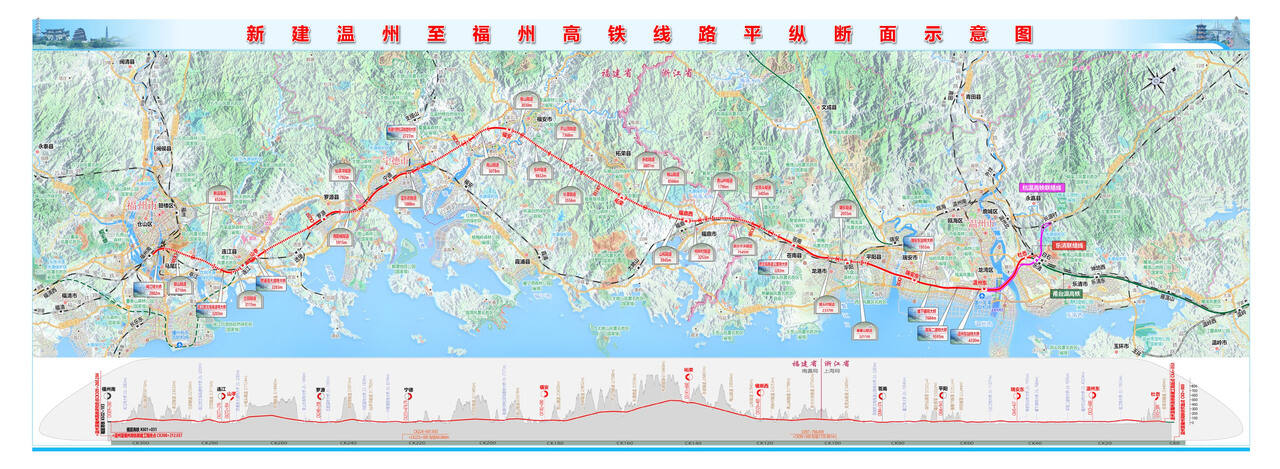 温福高铁跨越浙闽两省,是国家“八纵八横”高速铁路网沿海通道的重要组成部分。该线路起于温州的乐清站,向南经洞头区、龙湾区、瑞安市、平阳县、龙港市、苍南县后进入福建省境内,经福鼎、柘荣、福安后引入宁德站,最终沿杭深铁路通道抵达福州南站,与福厦高铁贯通。设计速度350公里/小时,温福高铁正线全长302.4公里、总投资约734.5亿元。其中浙江境内长98.86公里、投资约328.16亿元。