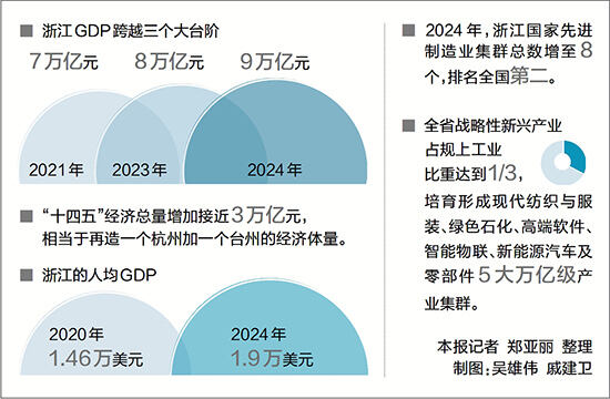 五年来,浙江经济总量节节攀升,连续跨越7万亿元、8万亿元、9万亿元三个大台阶,稳居全国第四。