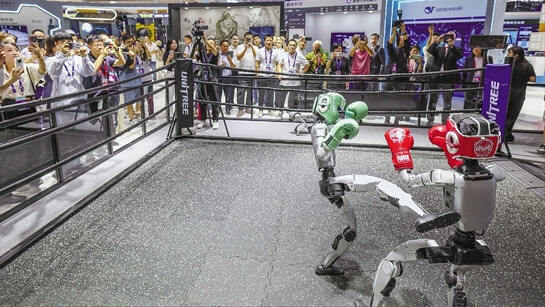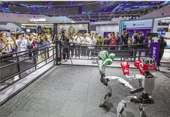 图为25日,杭州六小龙专区内,宇树科技的人形机器人在进行格斗擂台赛。 新华社记者 徐昱 摄