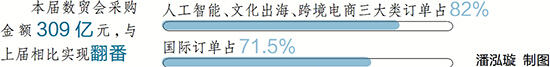 数贸会还带来了实实在在的订单。本届数贸会搭建精准对接平台,46场重点活动、110场企业主体活动和1219场次精准贸易匹配。从采购清单来看,“一带一路”、金砖国家占比超50%。特别是主宾国印度尼西亚,“数贸专机”跨越3000公里携百位印尼客商降落杭州,50亿元需求清单成为本届数贸会单国采购之最。据统计,本届数贸会采购金额309亿元,与上届相比实现翻番,其中人工智能、文化出海、跨境电商三大类订单占82%,国际订单占71.5%。比如,星物种机器人拿到1600多台订单,“图灵1号”系列清洁机器人订单额约3亿元,其中阿联酋客户预定了200台。