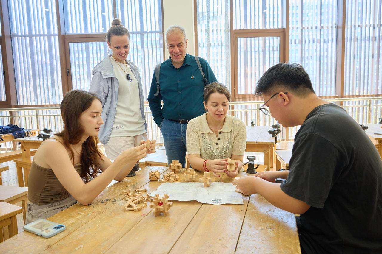 国际友人们还来到喜木木研学基地,体验孔明锁等榫卯积木制作技艺。陈列架上形态各异的木制摆件、精巧的榫卯模型与古朴的木工工具,瞬间点亮了“大孩子们”眼里的好奇目光,随后精巧的孔明锁又让他们发出由衷的赞叹。