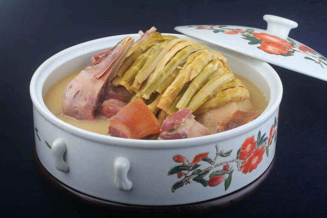 绍兴麻鸭炖汤 “陂放万头鸭”“群鸭暮归家”。在麻鸭原种保护地的绍兴,鸭是人们心目中的美食与养生之品。在绍兴民间对鸭十分看重,笃信其滋补养生,特别是三年以上的老鸭更是鸭中补品,以炖食为佳。火腿炖老鸭,是鸭肴中不老的神奇。而古越炖麻鸭是在此基础上改良而成,精工简烹,文火细炖,火候足时它自美,鸭香悠长,食之开胃生津,滋阴补虚,其味更胜一筹。