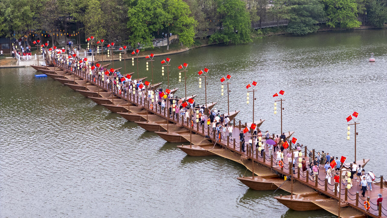 10月1日,浙江省金华市连通婺州古城与三江里商业街区的“新上浮桥”正式开通,桥两边红旗招展。拍友 胡肖飞 摄