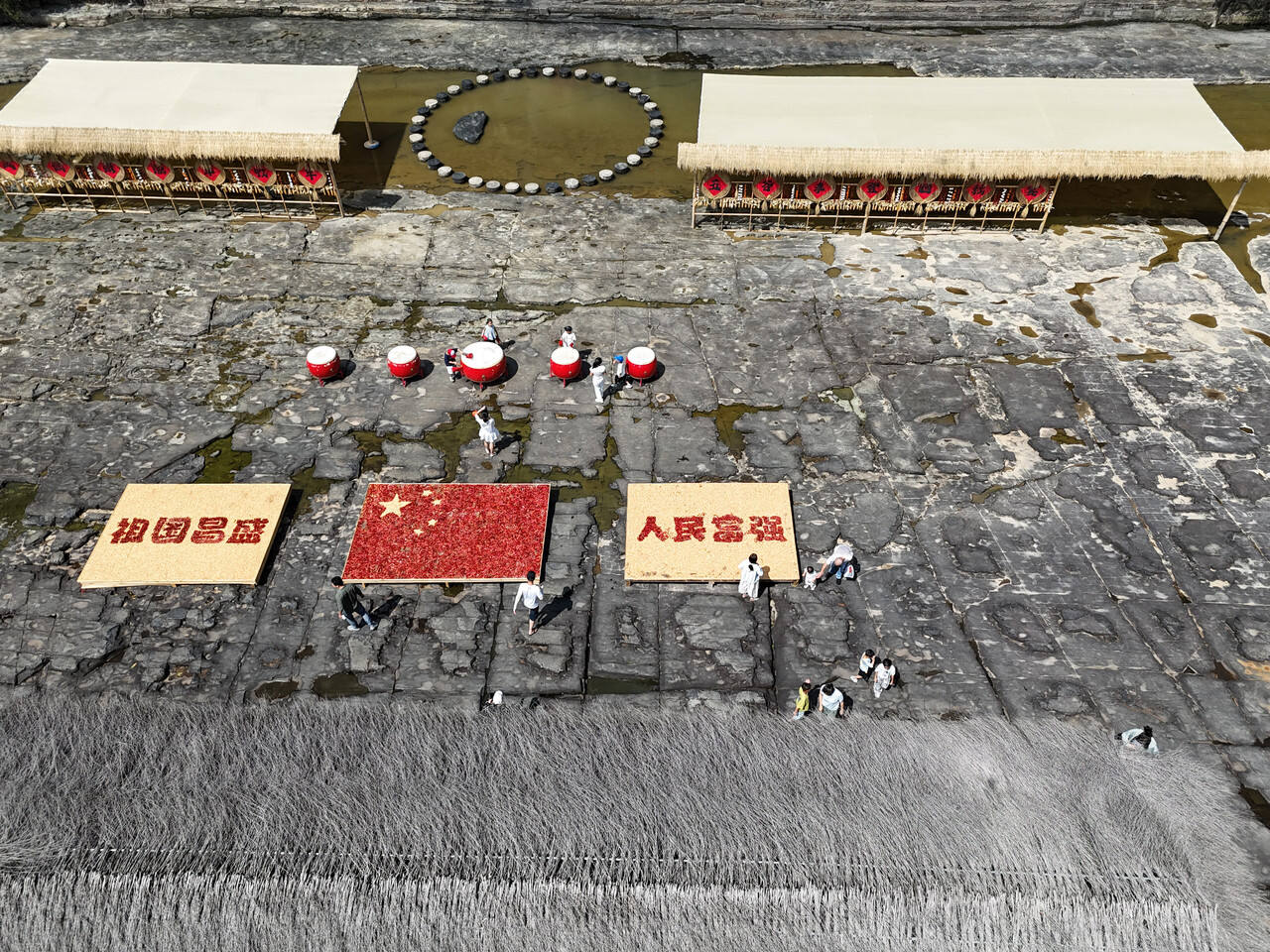 10月1日,温州市泰顺县南浦溪天然石壁晒场,农民们将辣椒摆成五星红旗和“祖国昌盛”、“人民富强”等字样,庆祝国庆节。拍友 蔡宽元 摄