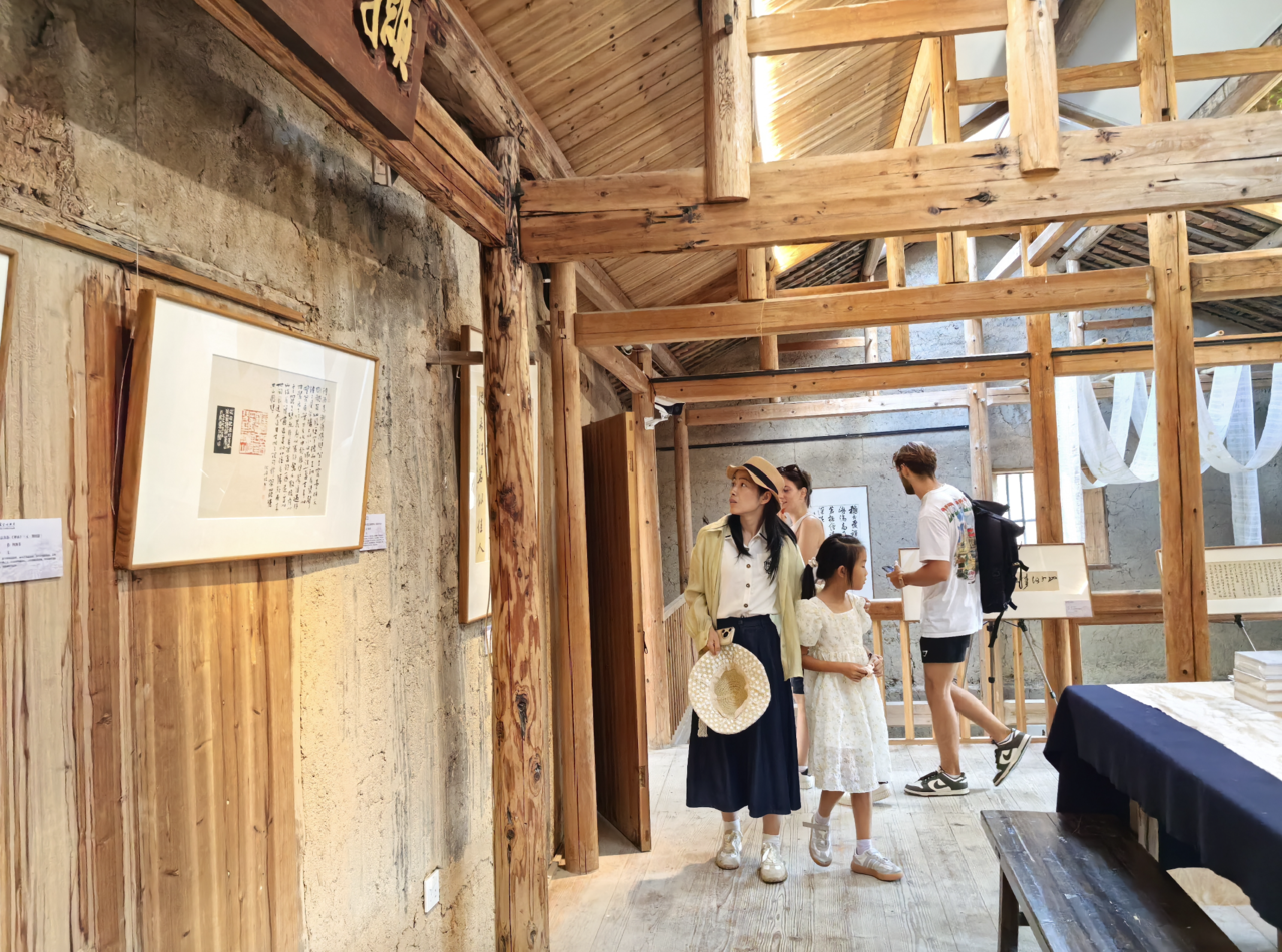 上午11时,第一批来自上海的游客抵达。住下没多久,他们就来到前台,询问有什么好玩的。“走,看书法展去。”带上客人,叶大宝直奔设在另一幢老屋内的书法展。
