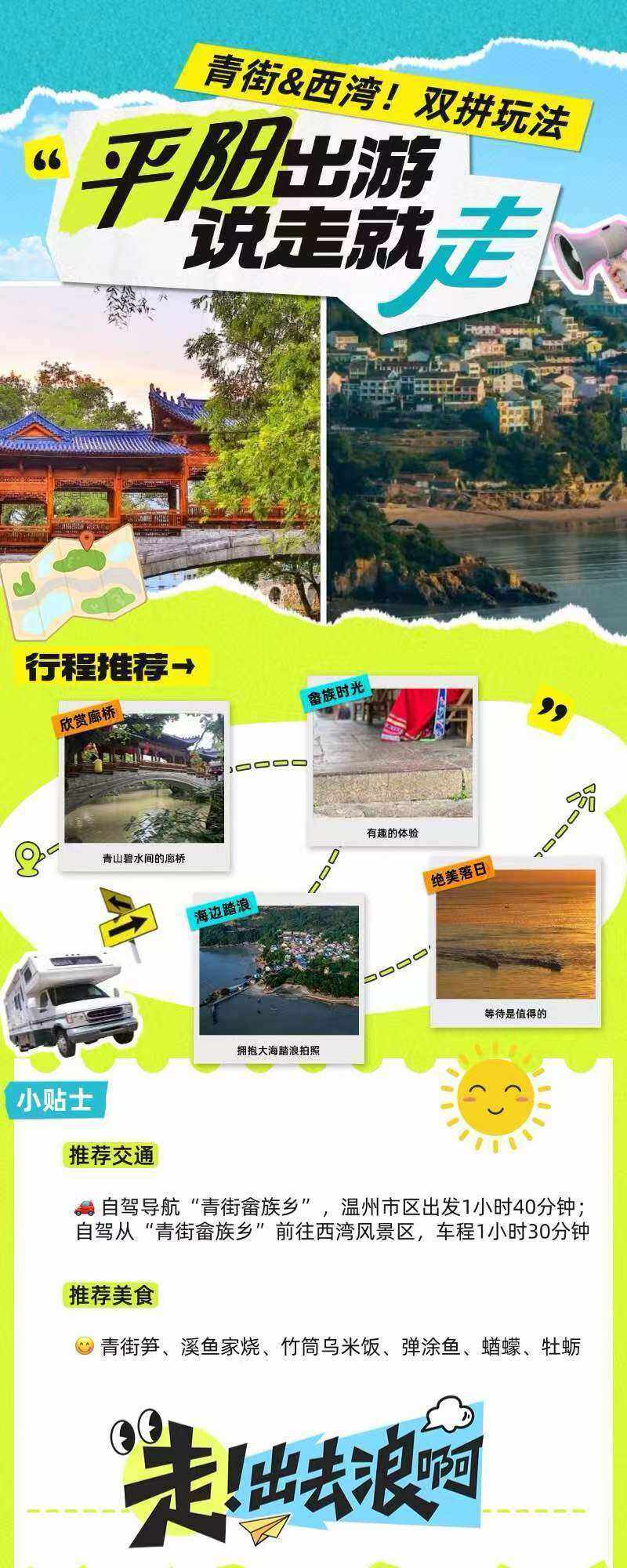 清晨启程奔赴青街,沉浸式探寻畲乡风情。午后驱车直抵西湾,携漫天霞光共舞。一日尽览畲乡烟火与海岸诗意,平阳的双拼玩法已就绪,更多藏在山水间的惊喜,待你亲自解锁。